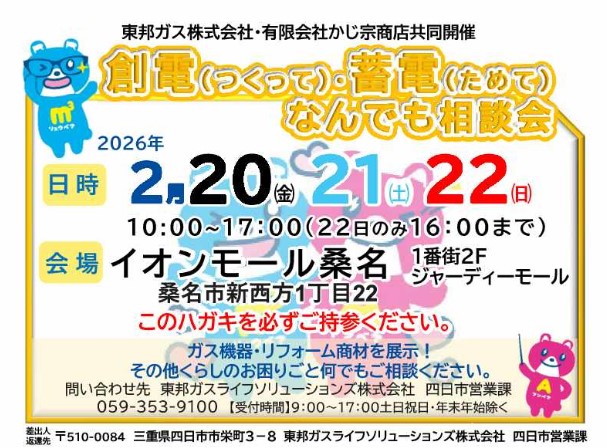 問い合わせ先:東邦ガスライフソリューションズ株式会社 四日市営業課 059-353-9100 (9:00-17:00 土日祝日・年末年始除く)