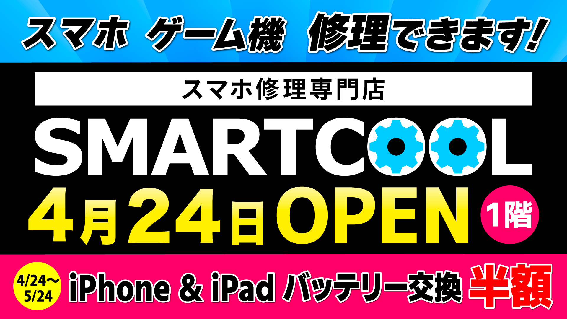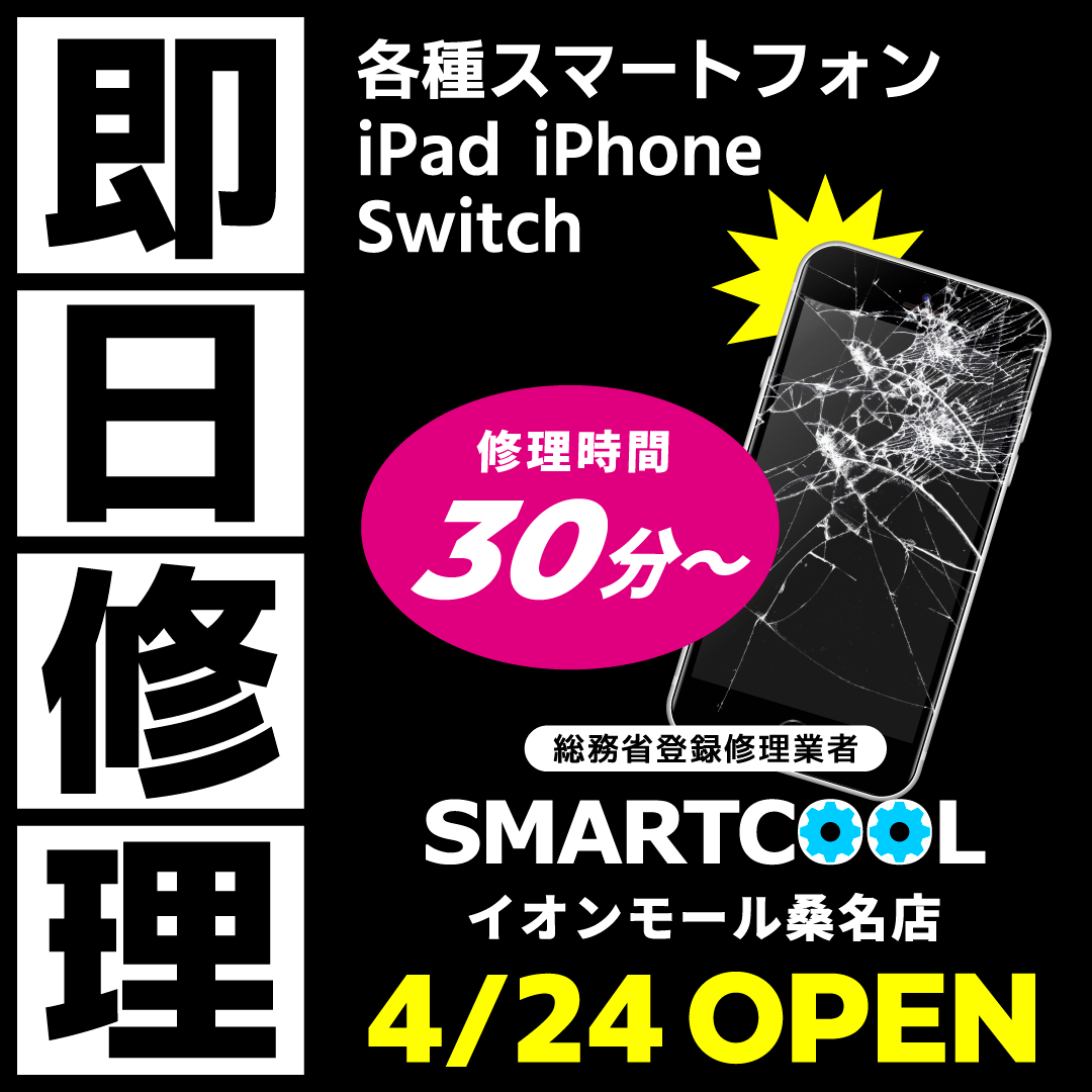 全国の大型モールに約130店舗、スマホ修理専門店スマートクールです。 データはそのままでバッテリー交換や画面交換など様々な不具合に対応します。 お気軽にご相談ください。 またタブレットや任天堂スイッチの修理も承ります。 人気の強化ガラスコーティング施工も行っております。